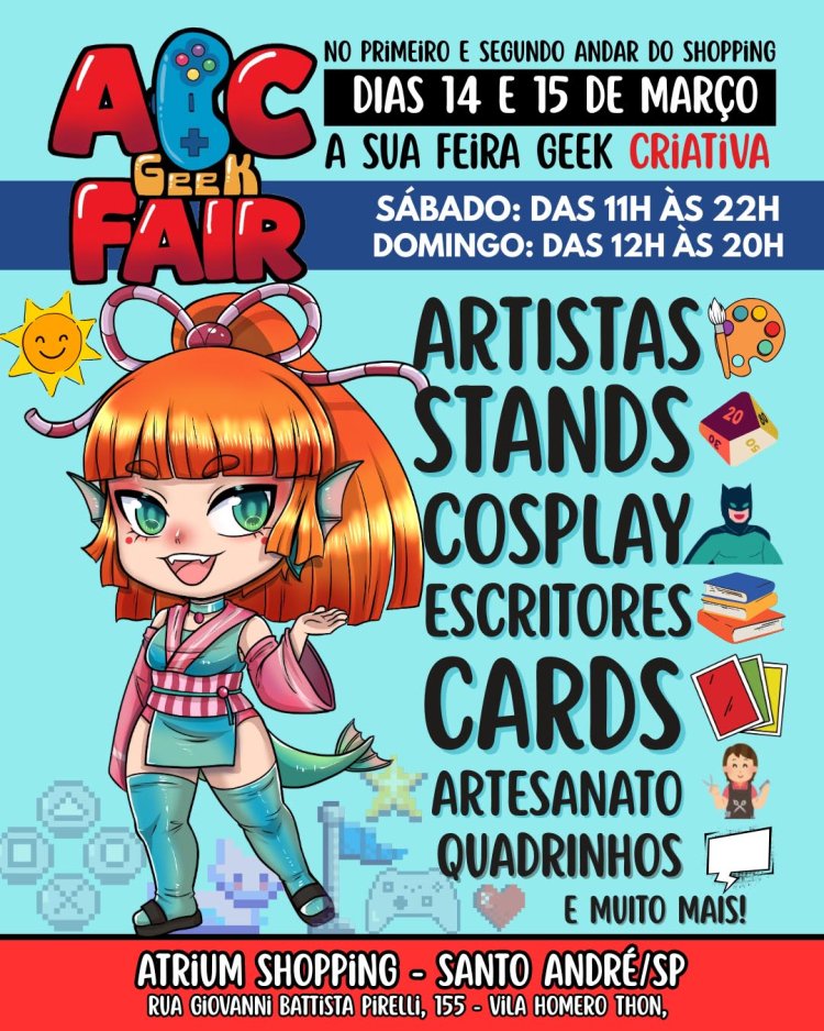 A ABC Geek Fair será realizada nos dias 14 e 15 de março, no primeiro e segundo andar do Atrium Shopping, em Santo André (SP), consolidando-se como uma Feira Geek Criativa voltada à valorização de artistas independentes e da produção autoral ligada à cultura pop, nerd e geek.
